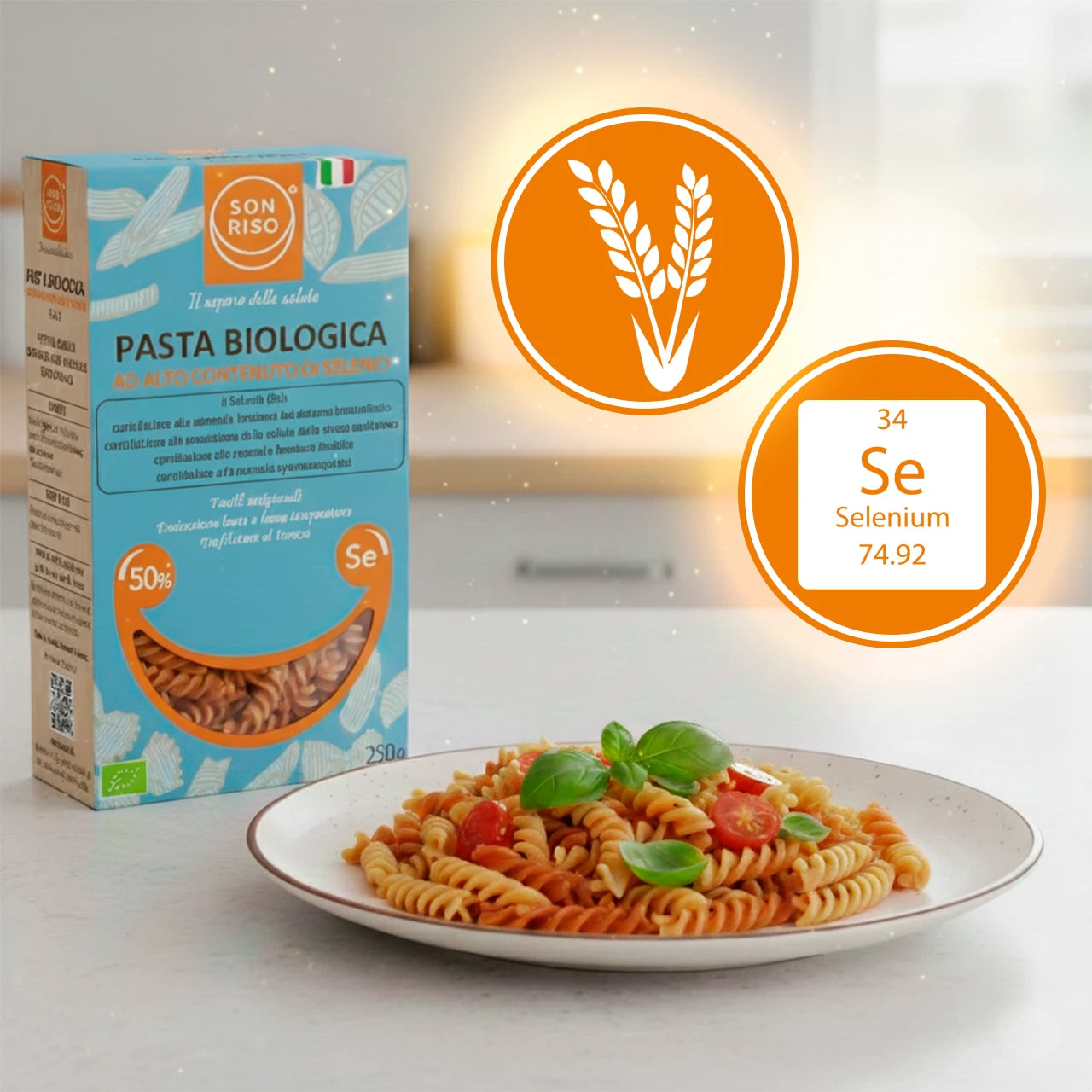 La pasta SONRISO rappresenta un alimento funzionale ottenuto da grano duro biologico italiano. Il selenio presente è naturalmente biodisponibile e facilmente assimilabile dall’organismo